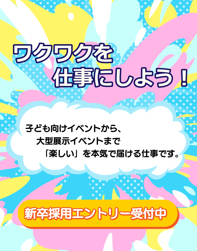 場所や地域に応じた、イベントの企画、着ぐるみや立体物の制作、ステージや物販運営など、